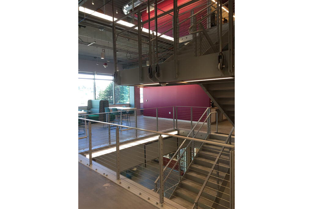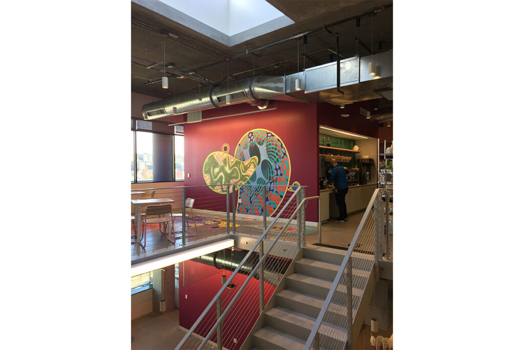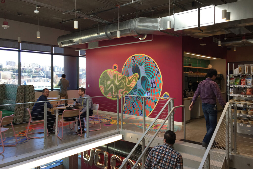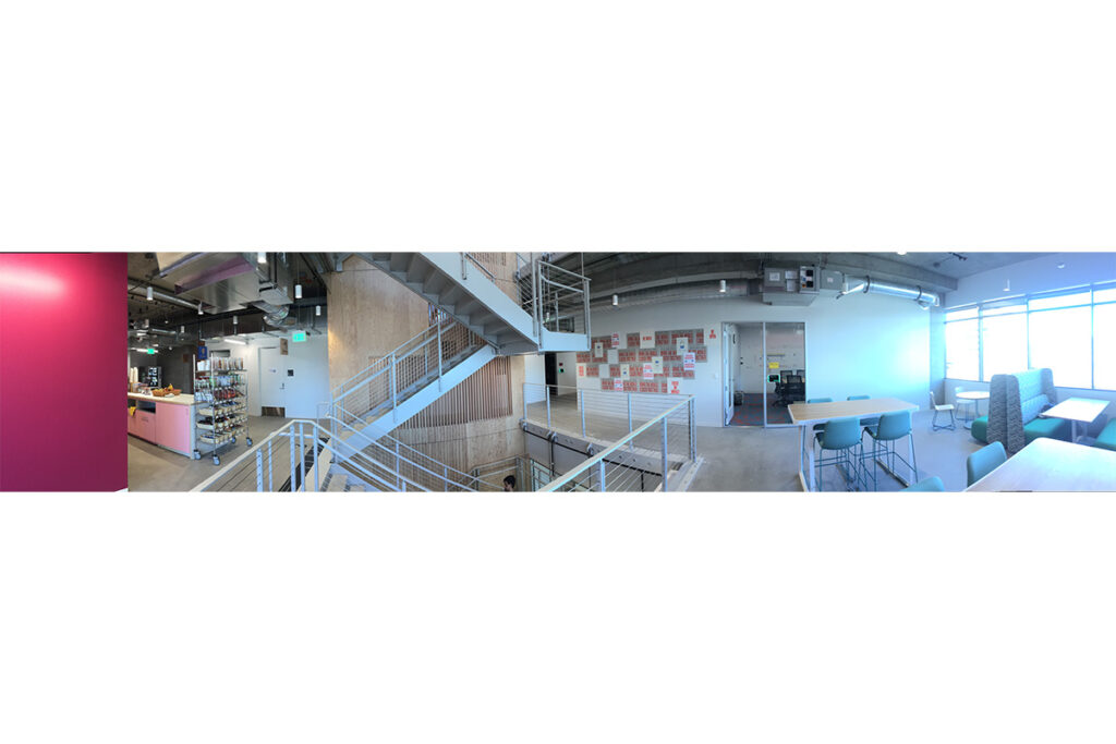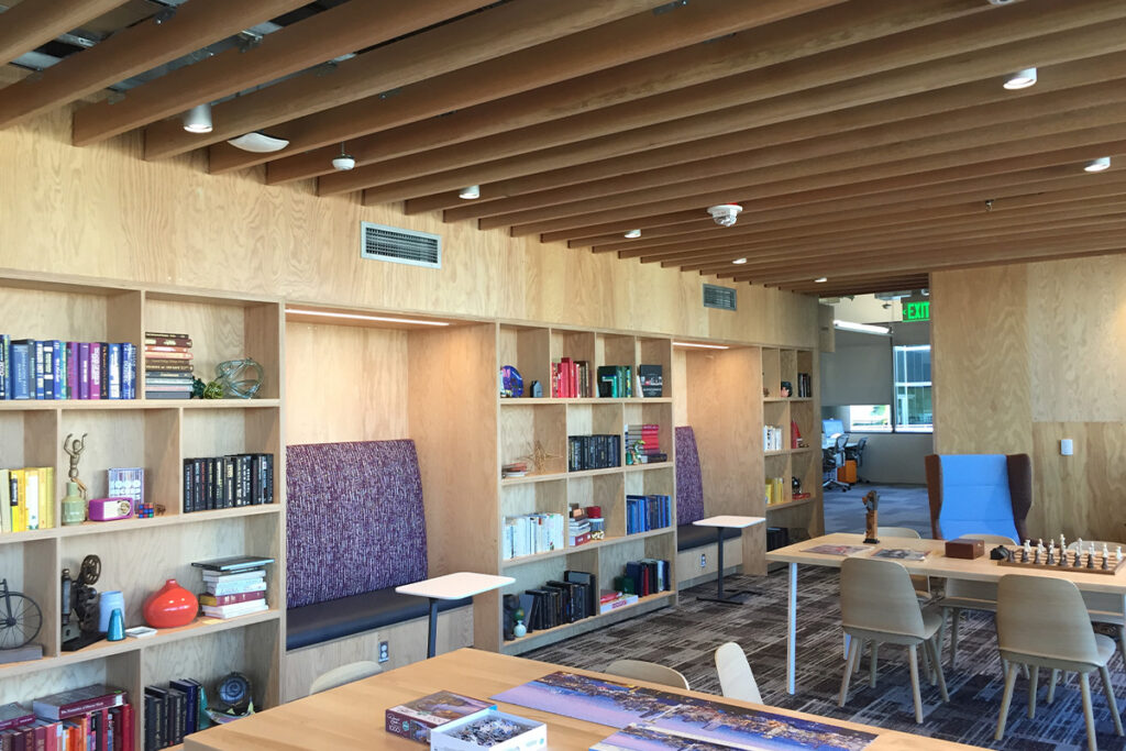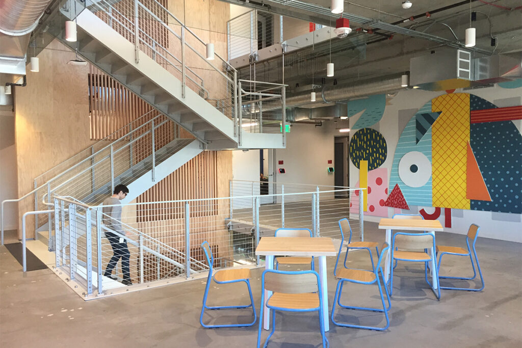 Tech Client Westlake Seattle, WA – The client’s user team wanted to have the feel of a campus within the building and bring a feeling of a “macguyvering” life and social media feel to the workplace.